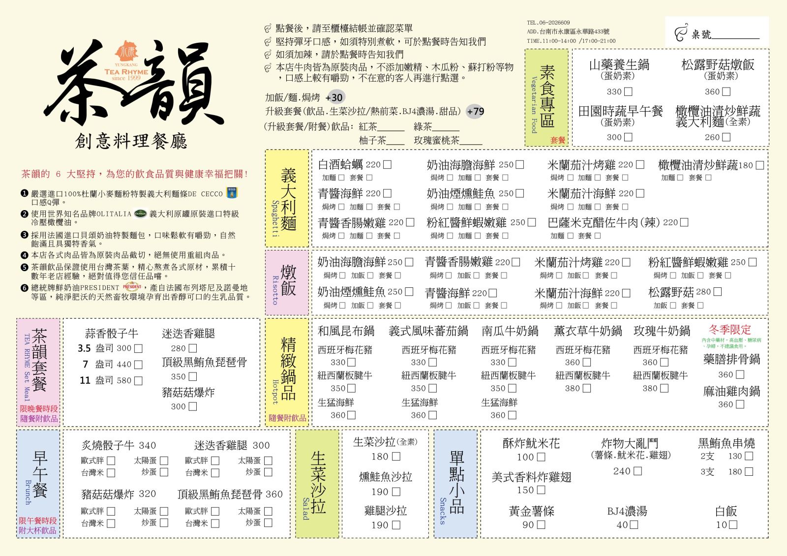 茶韻品牌創立於1999年,以茶飲起家,現在更多了料理的選擇。提供義大利麵、燉飯、火鍋、早午餐系列,是個適合用餐、休憩的好所在。